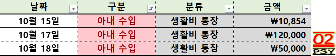 회사원인 제 수입은 월급을 받은 후로 엄청난 폭으로 감소한 걸 볼 수 있습니다. 확실히 회사원은 한 달에 한 번 몰아서 돈을 받은 후엔 수입이 없네요. 하지만 프리랜서로 일하고 있는 아내의 경우에는 꾸준하게 돈이 들어오는 편이라 10월 둘째 주에도 여전히 수입이 있습니다 ㅎㅎ 저희 부부의 경우에는 한 번에 많이 들어오는 회사원 월급 기준으로 생활비를 편성하고, 프리랜서로 지속적 수입이 생기는 아내의 수입으로 추가적인 투자를 편성하는 방법을 이용해보려 합니다